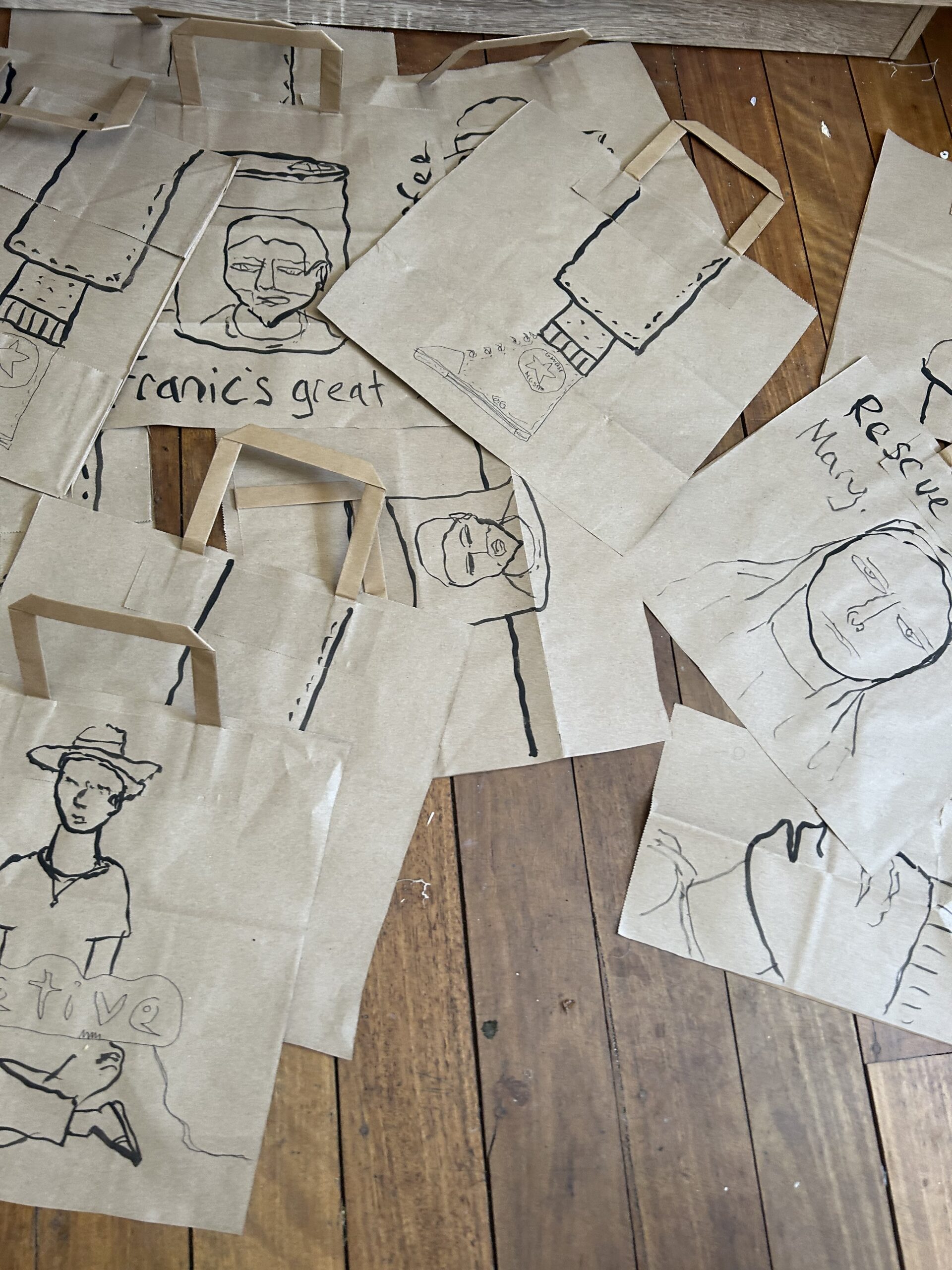 In conclusion the ideas in this shoot are quite simple the twenty-two drawings from today on cut up grocery bags mainly about the saints, the sketchbook with a sneaker: all-star/ Converse and the two bags with plaster doorways and all of them are about trying to find positive doorways in my mind.