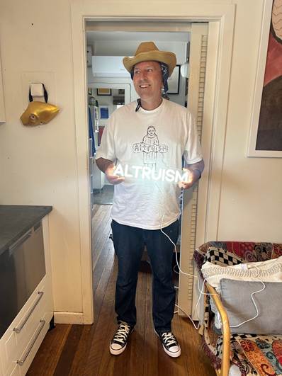 In the video and photos, I am wearing a white Vista Print T-shirt with a Mackillop black ink neon drawing I did a few weeks ago that features MacKillop with an altruism neon and converse sneakers so in other words MacKillop if she was alive today. In the video one part has me with a white altruism neon and the second part just with the t-shirt.