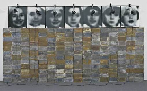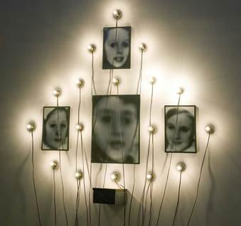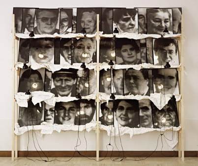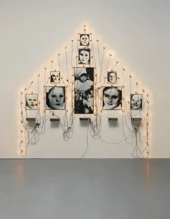 Monument/Odessa Christian Boltanski Date 1990 Medium Photographs, tin biscuit boxes, lightbulbs, glass, and electrical cords.