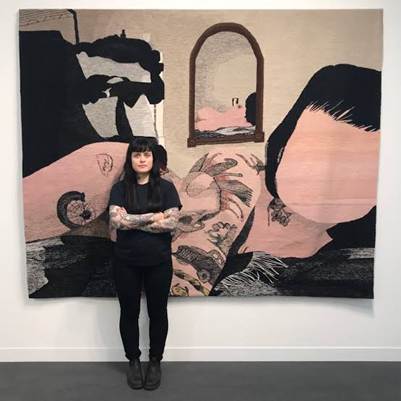 “Erin M. Riley: Uses a drawing-based approach to create hand-woven wool tapestries that focus on themes of sexuality and women’s issues.”