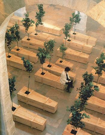 “At the 12th Biennale of Sydney in 2000, Yoko Ono famously exhibited Ex It (1998) at the Art Gallery of New South Wales. This installation consisted of 100 empty wooden coffins of varying sizes, each planted with a live tree, symbolizing life, death, and renewal, which stood as a memorable, poignant highlight of that year’s exhibition. “